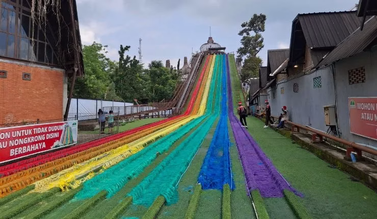 Tanpa banyak pemanasan, anak sulung langsung mengajak ayahnya mencoba wahana perosotan pelangi. Ketinggiannya sekitar 30 meter, dan nantinya melintasi lintasan sepanjang sekitar 130 meter.