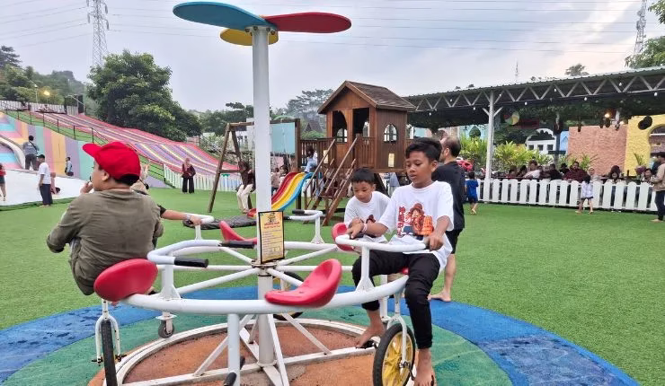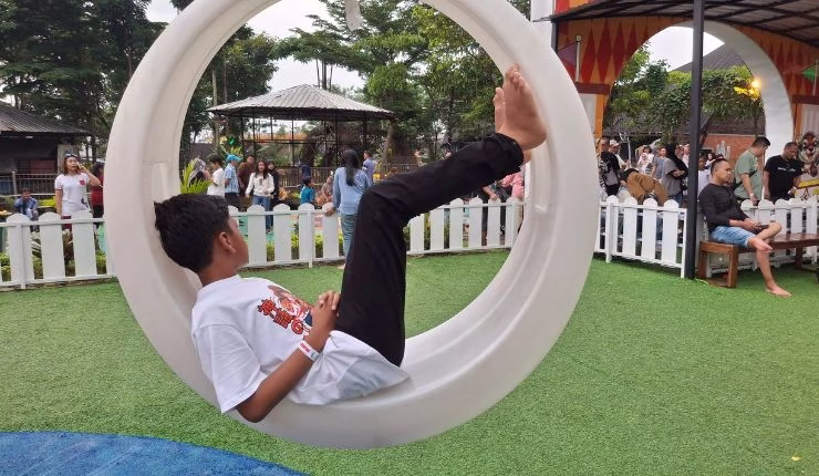 Meski beberapa area sedikit basah karena hujan, anak-anak tetap antusias. Mereka mencoba berbagai permainan, seperti memanjat dinding balon, bermain ayunan, meluncur di perosotan, hingga lompat-lompat di trampolin.