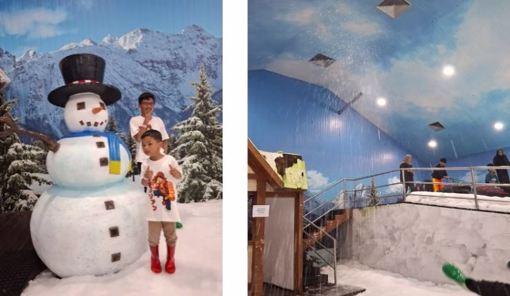 Setelah masuk ke wahana salju, suasana berubah seketika. Anak-anak langsung antusias bermain. Si bungsu duduk di ban besar dan ditarik oleh kakaknya. Mereka juga menikmati hujan salju buatan yang turun setiap beberapa menit.