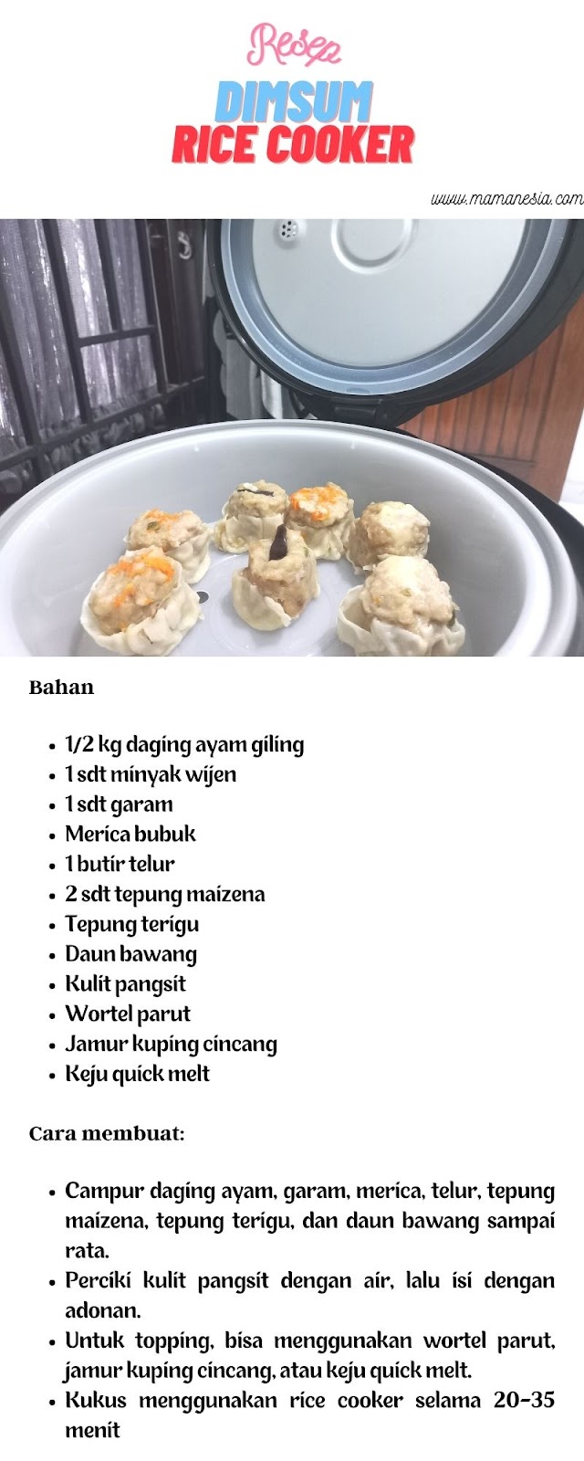 Sekarang, kita uji kemampuan fungsi lain rice cooker ini yuk. Dicoba untuk membuat dimsum yang cocok untuk sajian buka puasa. Ini dia resepnya.